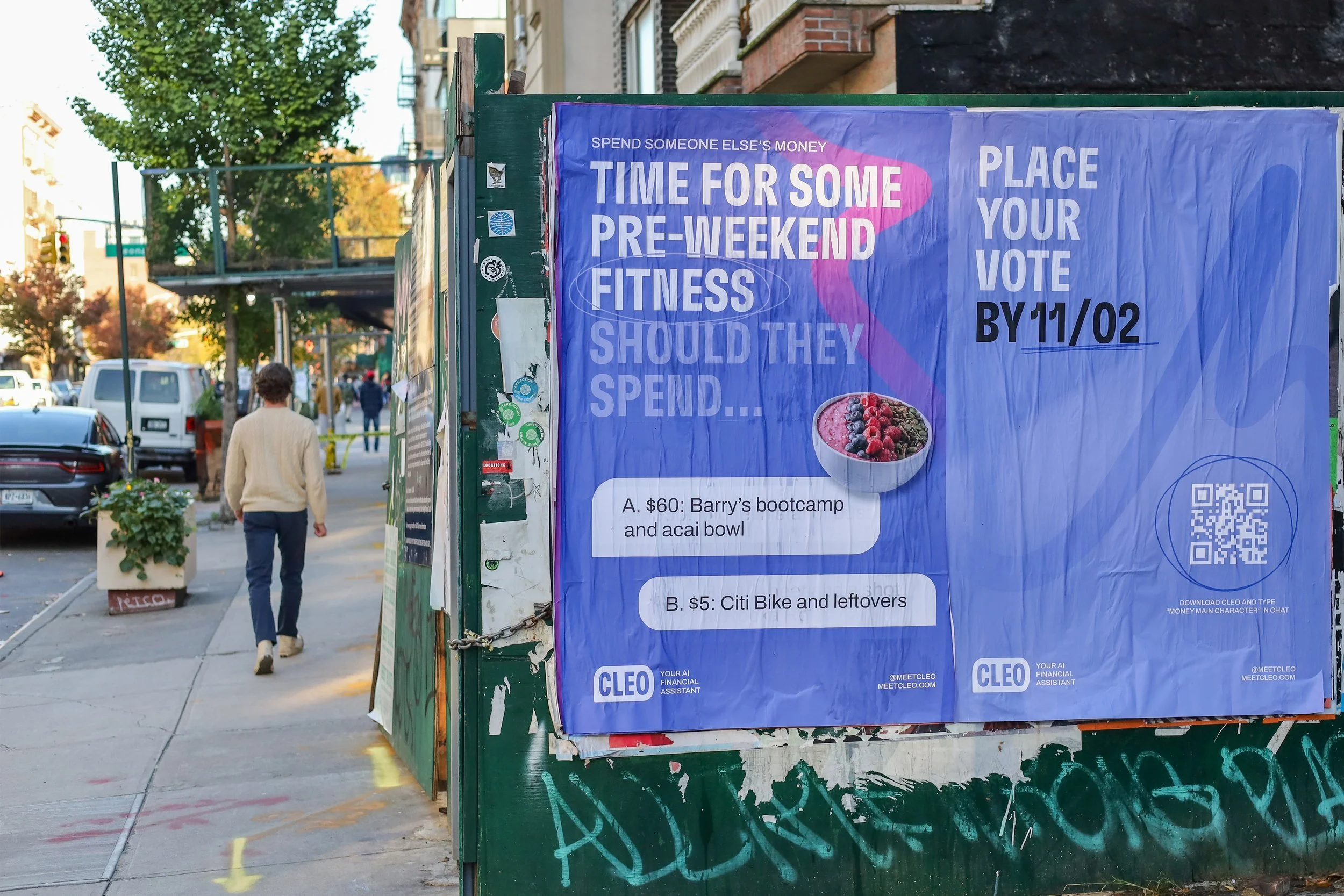 Save or spend? Cleo turned New York streets into a public poll, letting people decide whether Rana should hit Barry’s Bootcamp or grab her Citi Bike instead.