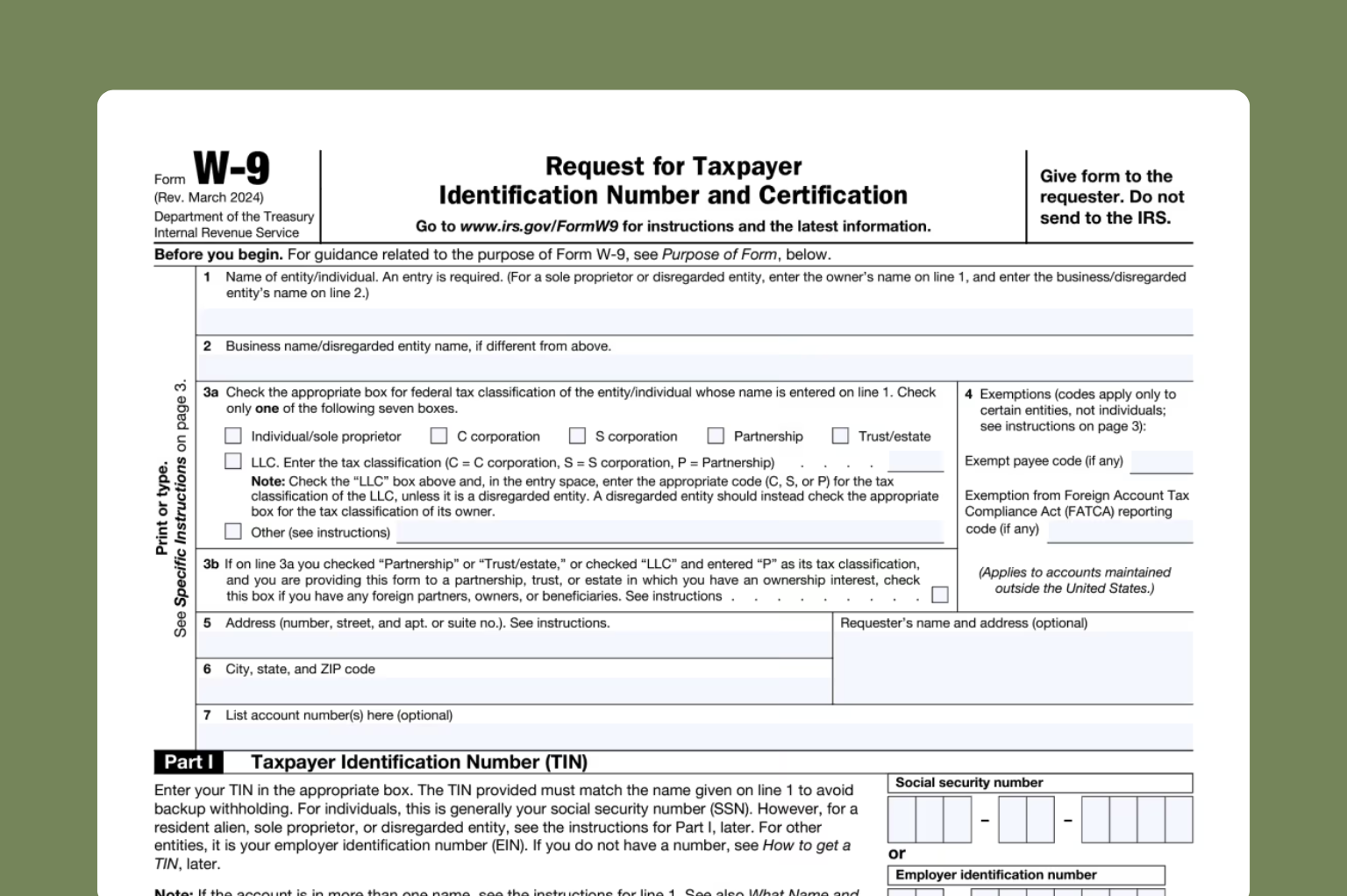 A W-9 is a form you complete and send to a company that pays you. It provides your tax information (name, address, SSN/EIN) so they (or us!) can report your earnings correctly.
